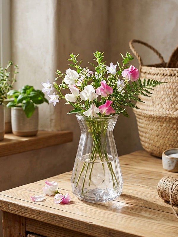 The Noor Glass Vase features a faceted, decorative silhouette designed to elevate floral arrangements with added texture and visual interest.